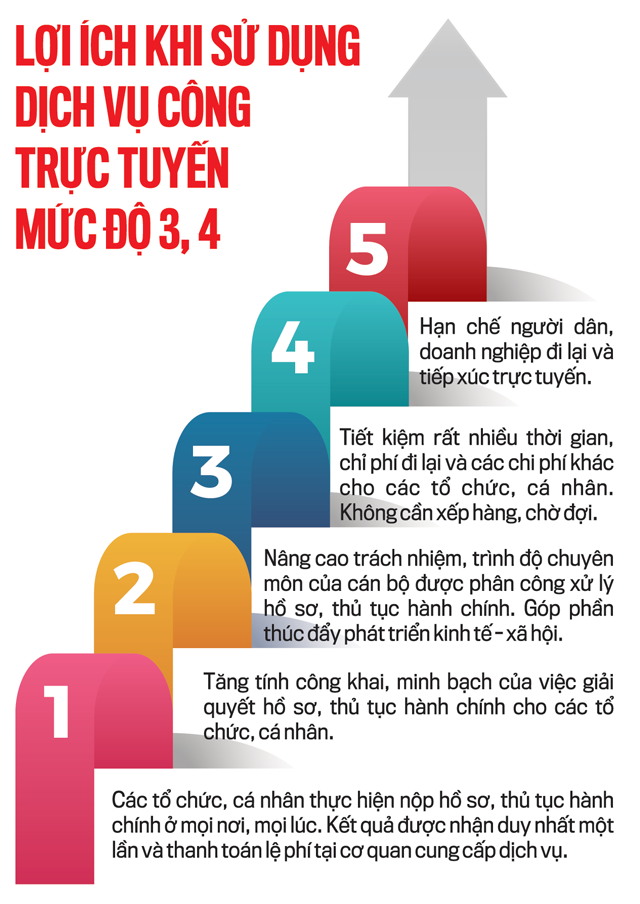 Và sáu là, triển khai các chính sách thúc đẩy, tăng số lượng dịch vụ công trực tuyến (trong đó, giao các cơ quan giảm thời gian xử lý đến 50% đối với dịch vụ công trực tuyến so với xử lý hồ sơ trực tiếp; buộc các cơ quan nhà nước phải sử dụng dịch vụ công trực tuyến của cơ quan khác, không được nộp hồ sơ trực tiếp; giao chỉ tiêu dịch vụ công trực tuyến cho từng cơ quan; chịu chi phí chuyển phát nộp hồ sơ, kết quả cho công dân qua bưu điện...).