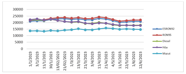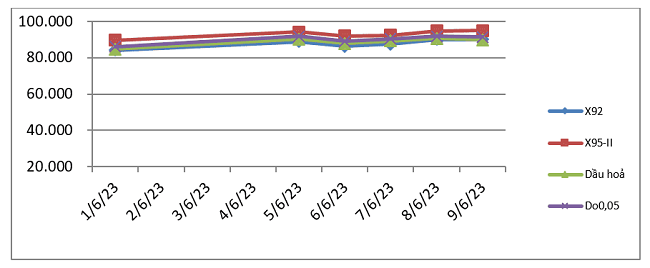 Cụ thể, bình quân giá thành phẩm xăng dầu thế giới giữa kỳ điều hành giá ngày 01/6/2023 và kỳ điều hành ngày 12/6/2023 là: 87,903 USD/thùng xăng RON92 dùng để pha chế xăng E5RON92 (tăng 0,465 USD/thùng, tương đương tăng 0,53% so với kỳ trước); 93,133 USD/thùng xăng RON95 (tăng 0,700 USD/thùng, tương đương tăng 0,76% so với kỳ trước).