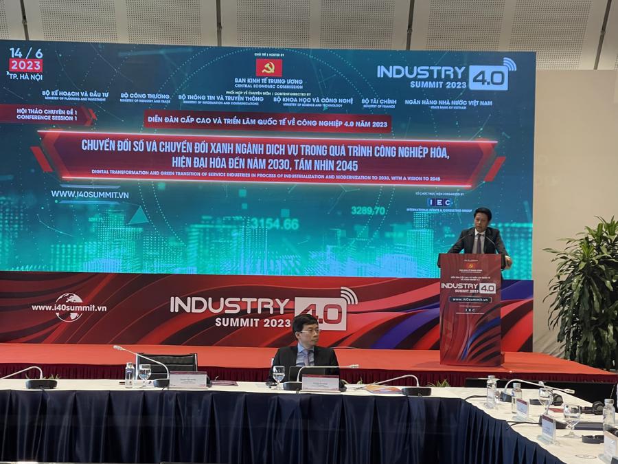 Ngày 14/6, tại Hà Nội, Ban Kinh tế Trung ương chủ trì, phối hợp với Bộ Công Thương và các ban, bộ, ngành liên quan tổ chức hội thảo chuyên đề 4 "Chuyển đổi số và chuyển đổi xanh ngành dịch vụ trong quá trình công nghiệp hóa, hiện đại hóa đến năm 2030, tầm nhìn 2045" trong khuôn khổ Diễn đàn cấp cao về Công nghiệp 4.0 năm 2023 với chủ đề “Thúc đẩy chuyển đổi số, chuyển đổi xanh để rút ngắn quá trình công nghiệp hóa, hiện đại hóa đất nước trong tình hình mới”.