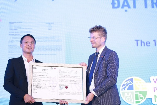 Ông Matthew Albon Crouch - Tùy viên Nông nghiệp (Vietnam, Indonesia, Singapore), Đại sứ quán Anh, đại diện Viện tiêu chuẩn Anh Quốc (BSI) trao chứng nhận trung hòa carbon cho lãnh đạo nhà máy sữa Vinamilk tại Nghệ An.