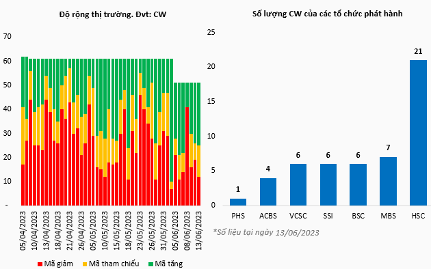 Thị trường cơ sở tiếp tục giữ được nhịp tăng và tạo tiền đề cho sắc xanh của thị trường chứng quyền. Kết thúc phiên giao dịch ngày 13/06/2023, toàn thị trường có 26 mã tăng, 12 mã giảm và 13 mã tham chiếu.